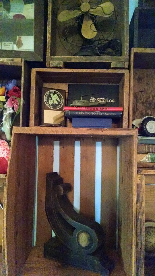 | Top: antique fan Middle: Uncle Davy's pilot log Bottom: antique corbel |